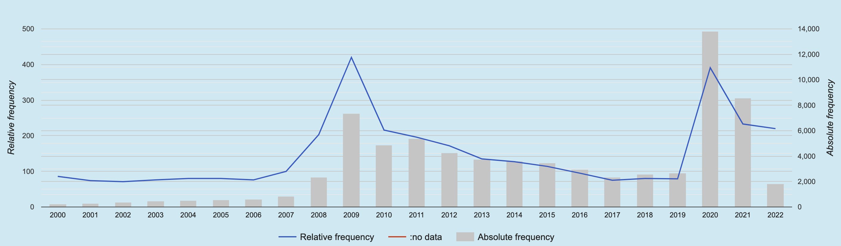 Korpusos, kam pievienota birka diahronisks, noSketchEngine programmrīkā tagad var analizēt valodas vienību izplatību (absolūto un relatīvo biežumu) pa gadiem (skat. attēlu).